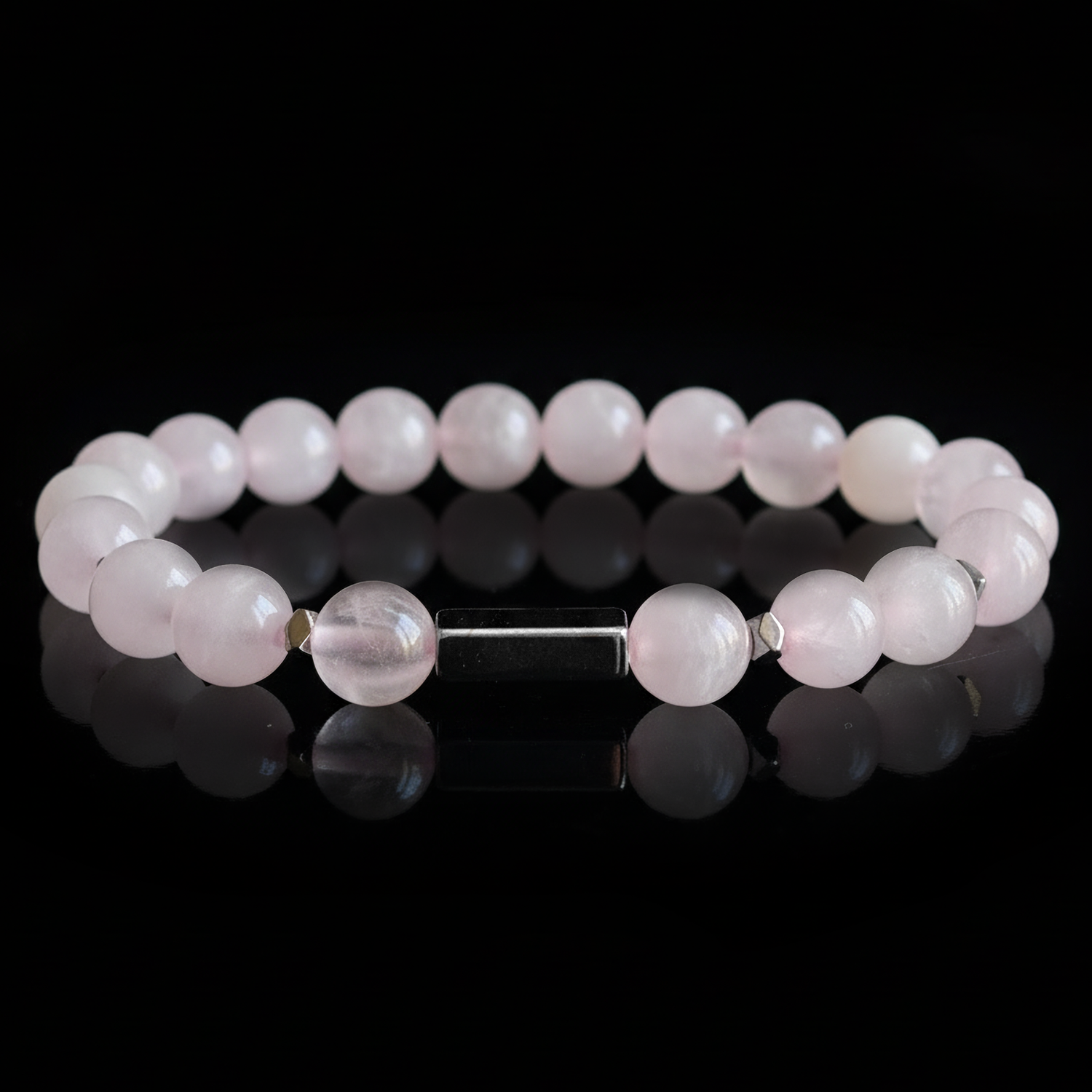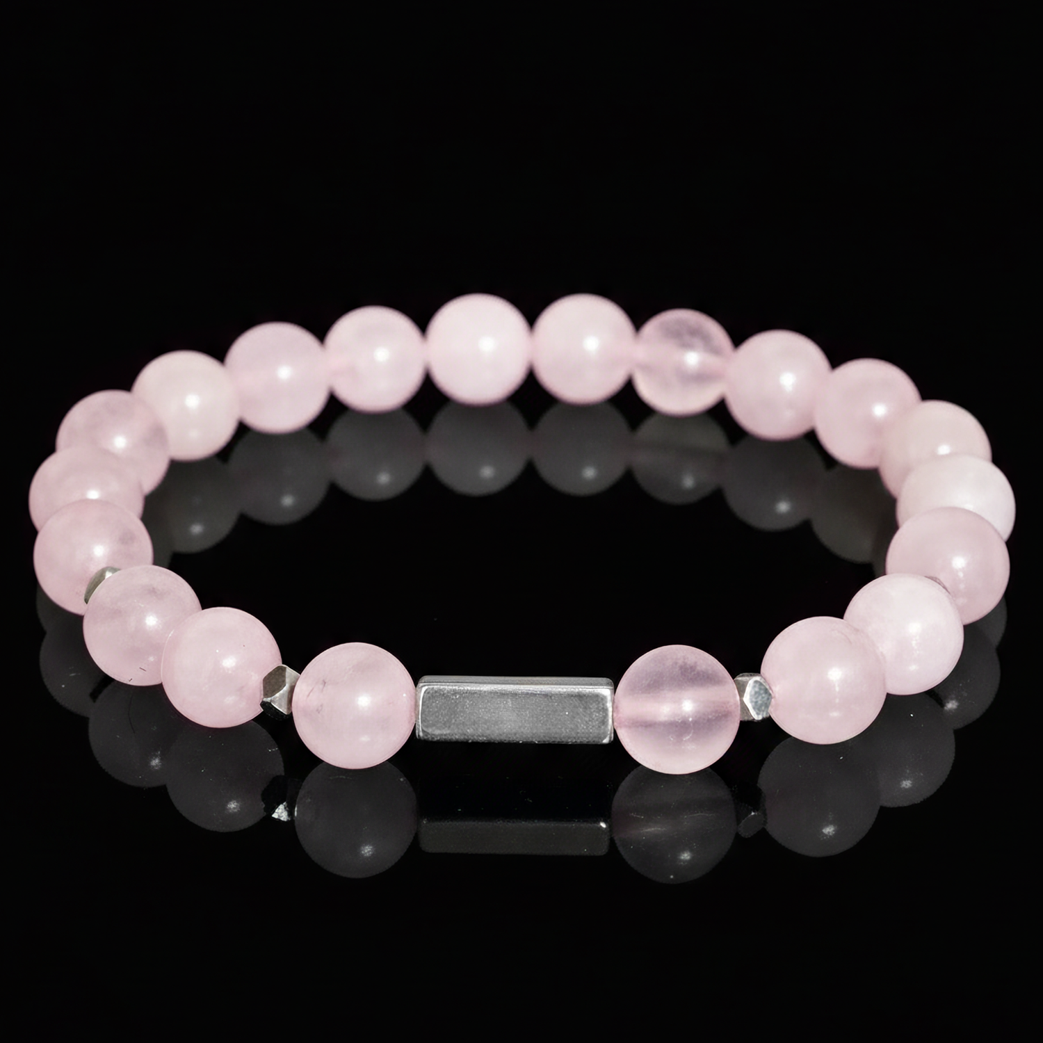 Браслет собран из бусин розового кварца диаметром 8 мм. Камень отличается мягким нежно-розовым оттенком с легкой полупрозрачностью и естественными природными переходами цвета. Благодаря этому украшение выглядит деликатно и женственно.