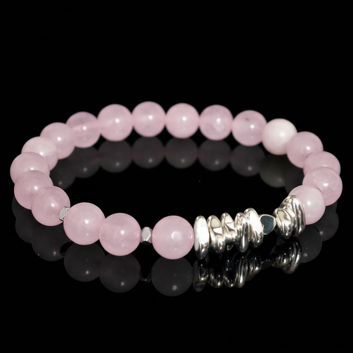 Браслет выполнен из бусин розового кварца диаметром 8 мм. Камень отличается нежным пастельным оттенком и легкой полупрозрачностью, благодаря чему украшение выглядит мягко и женственно. Натуральная текстура кварца делает каждый браслет немного уникальным.