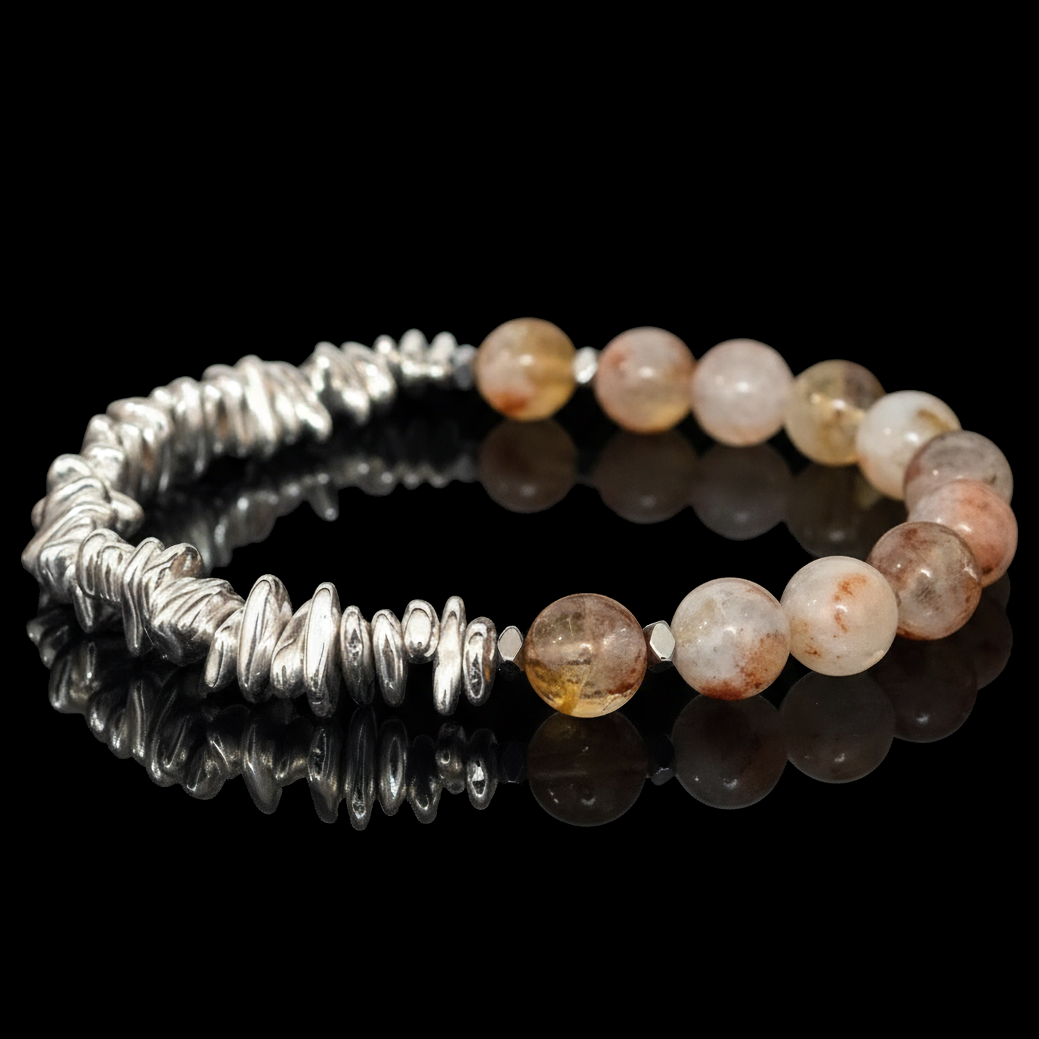 Серебристые бусины из гематита свободной формы создают интересную фактуру и придают браслету современный характер. Их металлический блеск красиво контрастирует с тёплым оттенком цитрина, формируя гармоничное и выразительное сочетание.